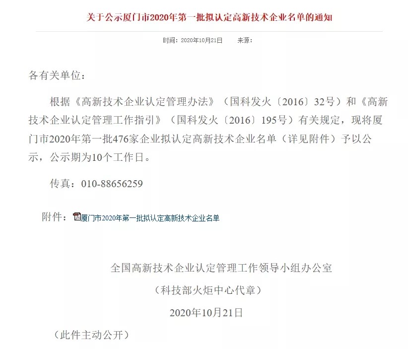 以下為《關(guān)于公示廈門市2020年第一批擬認(rèn)定高新技術(shù)企業(yè)名單的通知》公示通知文件。